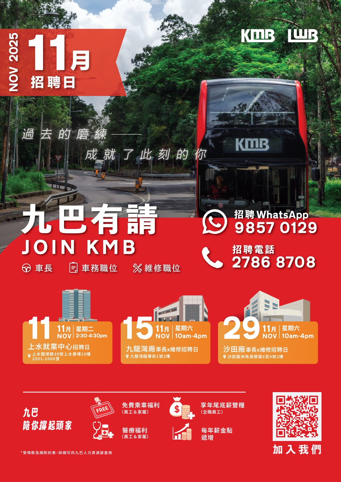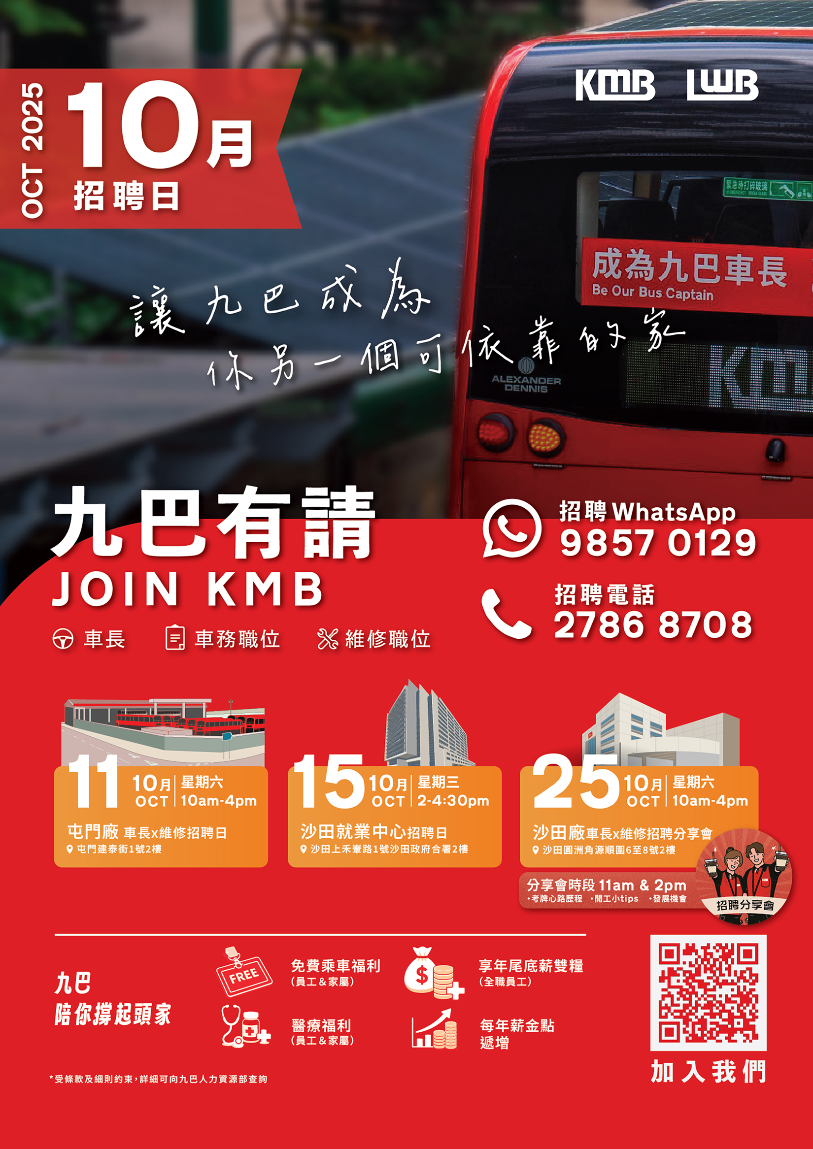 填妥之申請表格可電郵至 recruitment@kmb.hk, 或傳真至34750904,或郵寄九龍九龍灣臨華街一號二樓,九龍巴士(一九三三)有限公司人力資源部招聘中心收,信封面註明「機密」。應徵者於六星期內未被邀約面試,則作落選論。