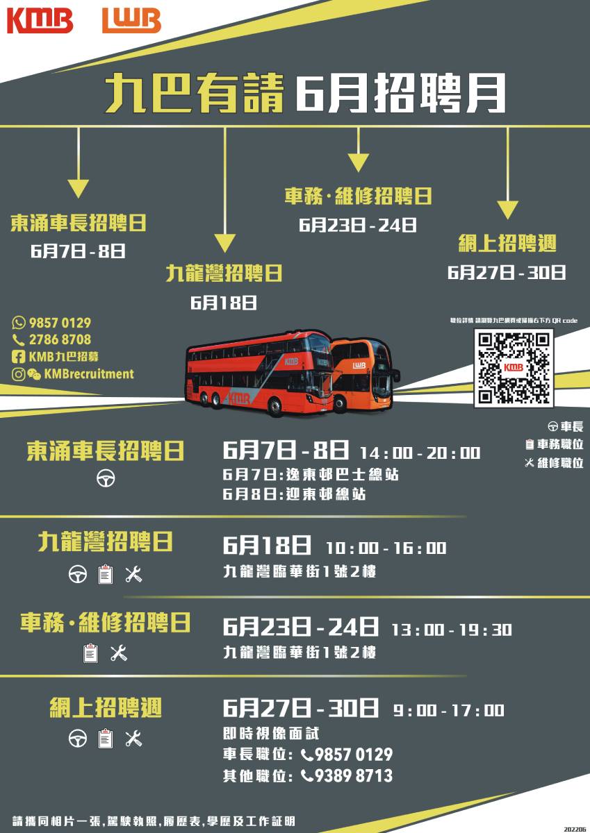 除了重視培訓現有員工,九巴亦不斷積極吸納優秀人才,一月十至十五日(星期一至六)將首次舉辦「網上車長招聘周」。有意申請成為車長的求職者可於上午十時至下午四時,聯絡九巴人力資源部(電話2786-8708或WhatsApp 9857-0129),以視像方式進行面試。九巴亦會於一月十六日(星期日)舉辦車長招聘日,為已預約的求職者安排面試及駕駛測試。