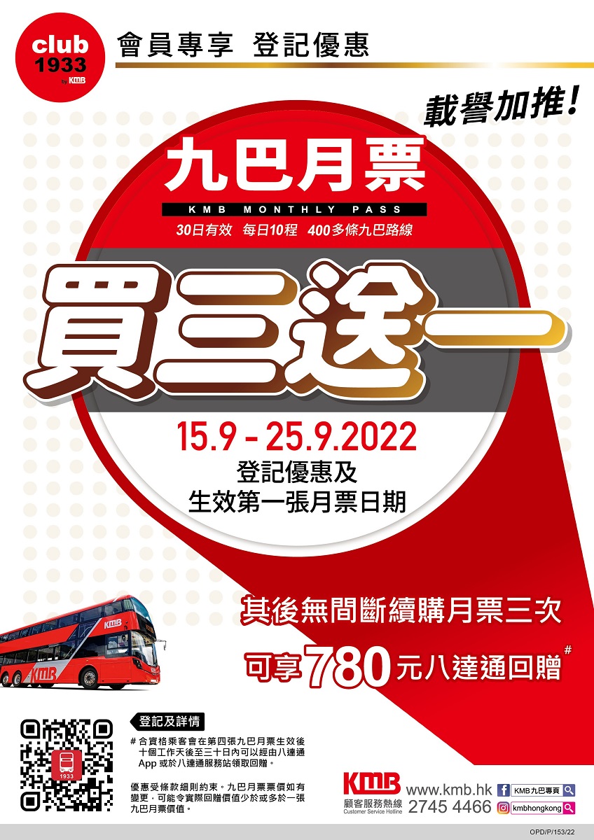 同時,「九巴月票」乘客登記九巴會員計劃「club1933」成為會員,可自動賺取780分,連同200迎新積分,首次登記可享980分,換取九巴口罩及其他精美禮物。