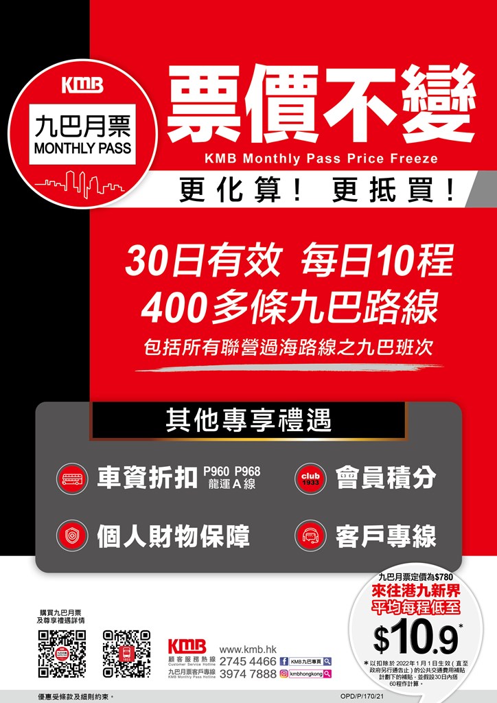 The Kowloon Motor Bus Co. (1933) Ltd. (“KMB”) is extending its exclusive privilege to KMB Monthly Pass holders. Passengers possessing a valid KMB Monthly Pass can take 15 designated “A” Routes operated by Long Win Bus Company, or KMB New Long-haul Bus Routes P960 [Siu Hong Station (North) ⇋ Wan Chai (North)] and P968 [Long Ping Station/ Yuen Long (West) ⇋ Tin Hau] at a fare up to 73% off. The promotion period is valid until 30 November 2022.