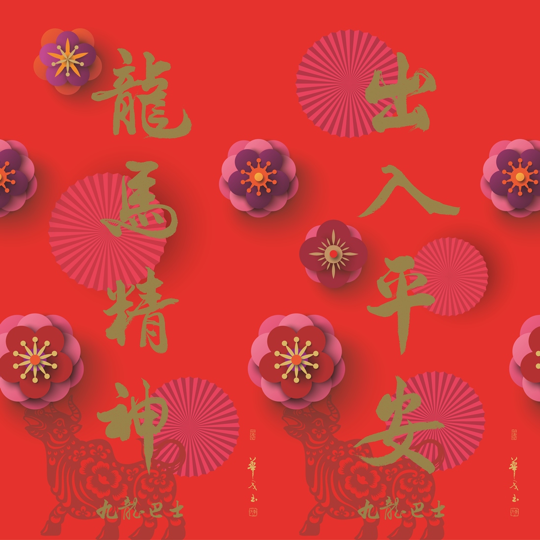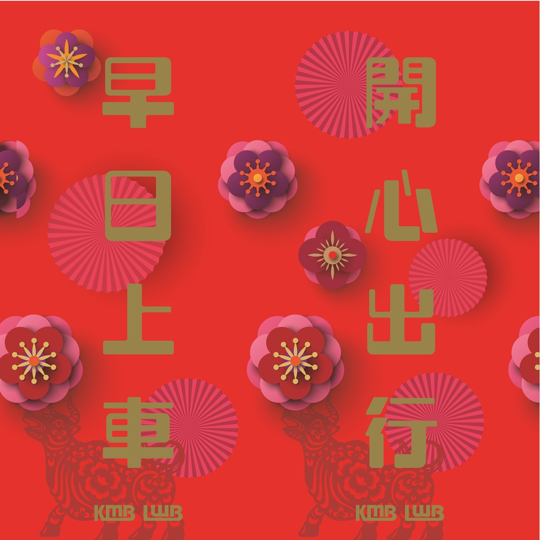 九巴辛丑牛年賀年揮春採用雙面設計,正面寫上傳統祝福語「出入平安」、「龍馬精神」,由本地著名書法家華戈揮毫:背面則寫有不少香港人的祝願 —「早日上車」、「開心出行」。背景圖案「對花」,可自由配搭合心意的組合,為新一年添個好意頭。