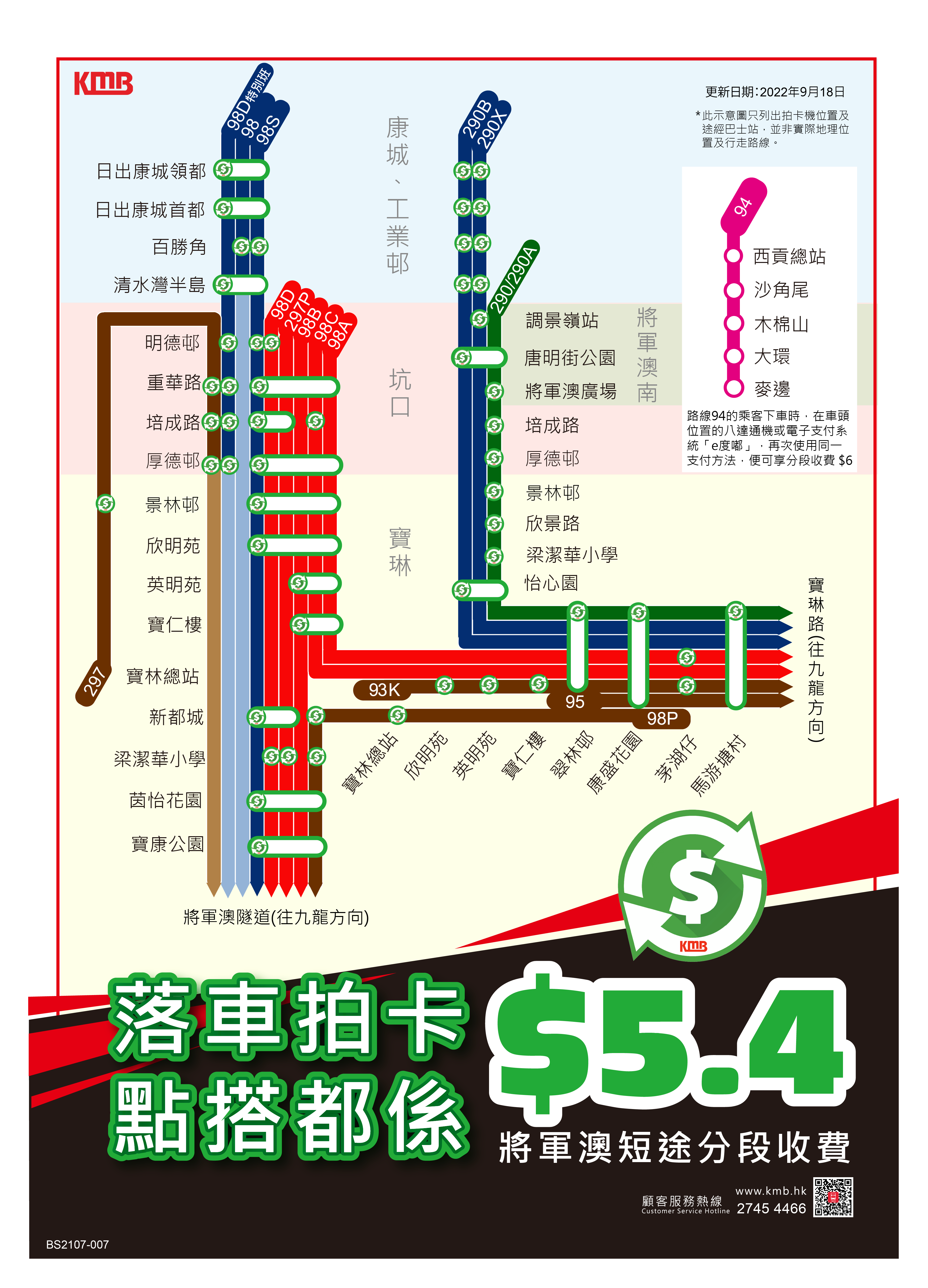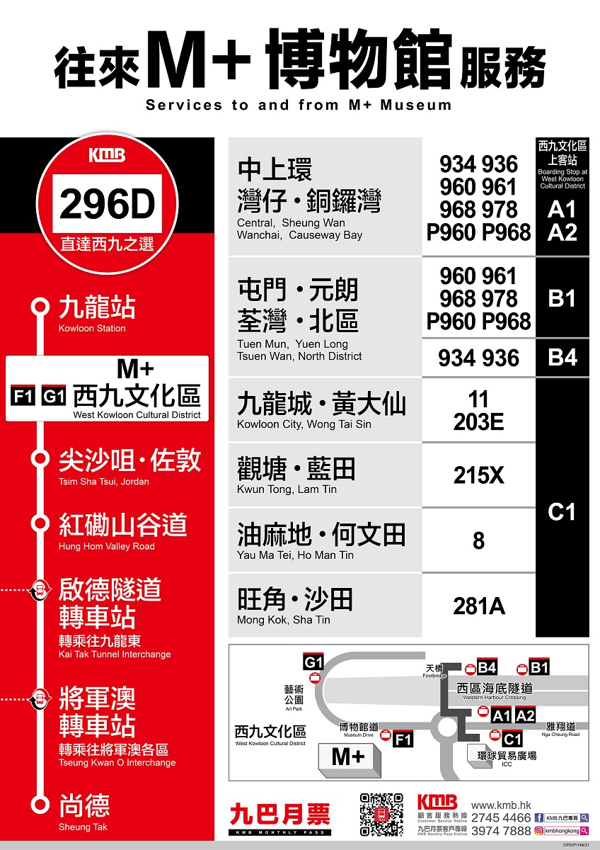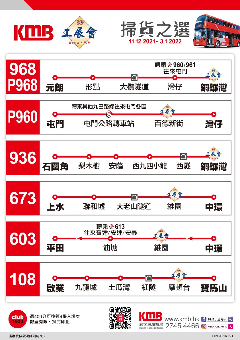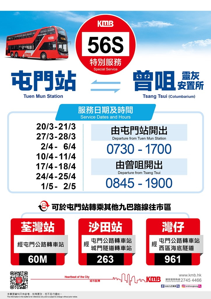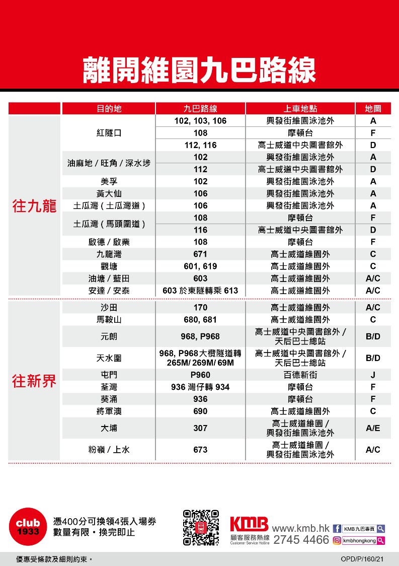 乘客可致電九巴顧客服務熱線2745-4466,或使用九巴網頁www.kmb.hk及智能手機應用程式App1933查詢詳情。