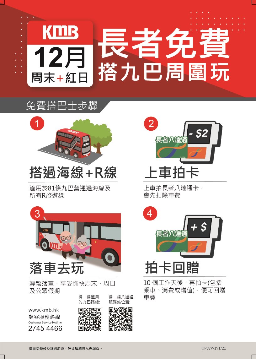 九巴繼續為長者提供乘車優惠,由2022年1月1日至2月6日,長者在所有周末、公眾假期及新春期間,乘搭八十二條九巴過海線1及所有R旅遊線,每搭四程即可獲贈一包十個的成人九巴口罩,多搭多送。