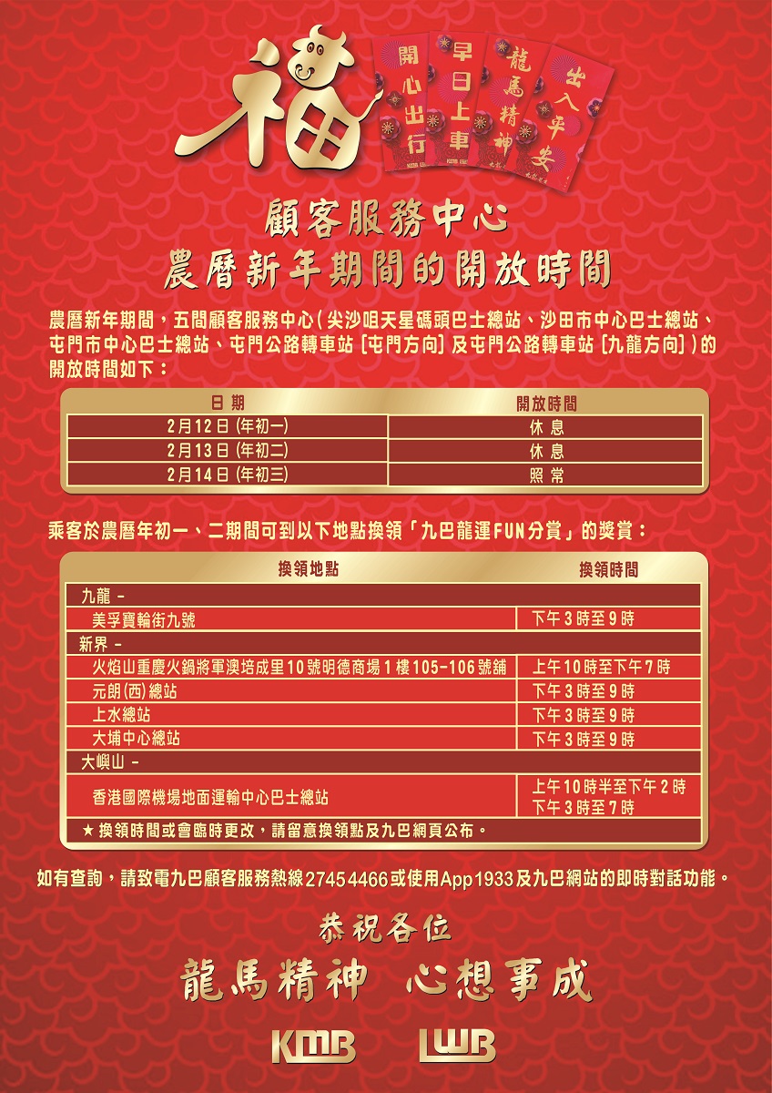 二零二一年農曆年初一(二月十二日)、初二(二月十三日),「九巴龍運FUN分賞」換領安排如下: