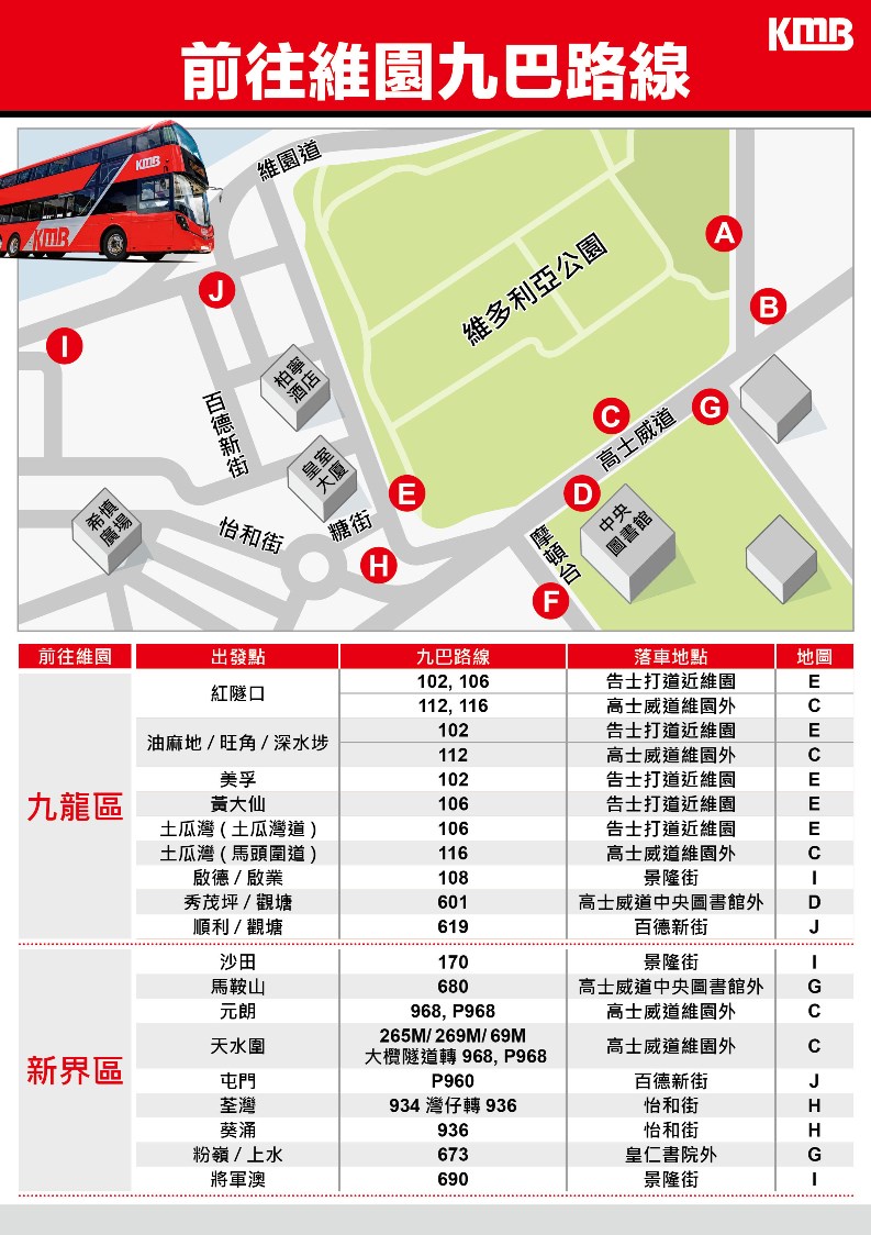 因應一月十日(星期日) 東鐵線旺角東站至紅磡站的列車服務暫停,預料來往新界東及市區的客流量或會上升,九巴將密切監察相關路線,包括下表所列直接路線的使用情況,及時作出車務調動以應付需求。