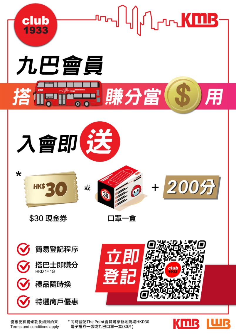 長者以長者八達通咭或長者八達通產品,於 2022年1月的所有周六、周日,以及2月1-6日 (農曆年初一至初六),乘搭由九巴營運的過海巴士線1及所有R旅遊線,每搭滿四程,即可獲贈九巴三層耳掛式成人口罩十個。九巴系統會自動計算長者乘搭的合資格車程次數,毋須額外登記。如需查閱,長者在乘搭九巴指定路線八日後,登入club1933,便可查閱合資格車程數目。