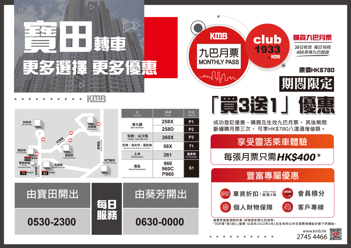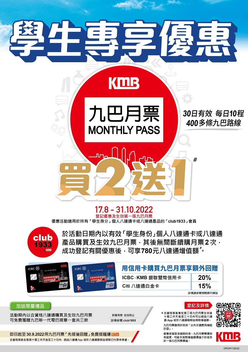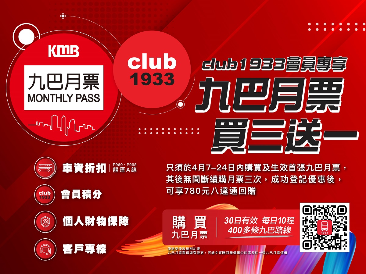 同時,「九巴月票」乘客登記九巴會員計劃「club1933」成為會員,可自動賺取780分,連同200迎新積分,首次登記可享980分,換取九巴口罩及其他精美禮物。